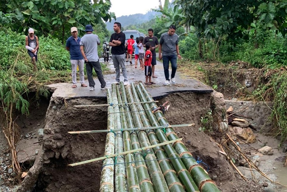 “Kondisi jalan sudah putus total dan kami sebagai warga masyarakat berinisiatif membuat jembatan darurat menggunakan bambu agar bisa lewat sambil menunggu perhatian pemerintah,” ungkap Dominikus.
